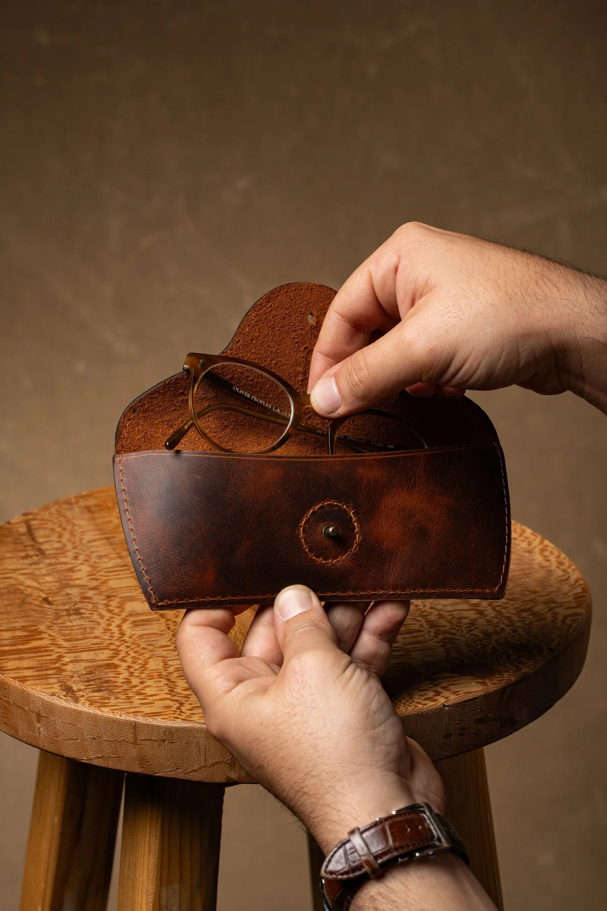 Kılıfın iç kısmındaki yumuşak deri dokusu, gözlüğünü çizilmelere karşı korur. Kopçanın iç kısmı dikişlidir, böylece gözlüğünüze sert bir şey denk gelmez ve zarar görmez.